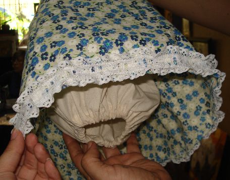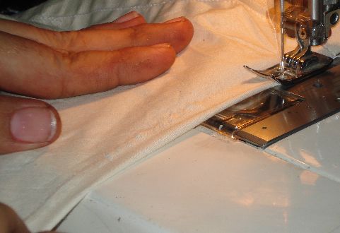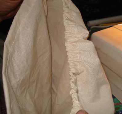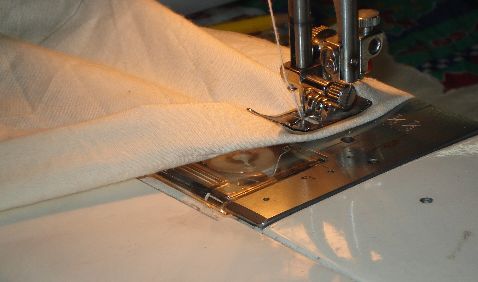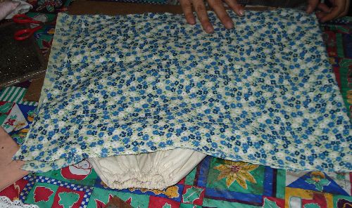 Si observas detenidamente, podrás notar que hemos doblado el ruedo en la Tela de Manta, ésto nos servirá para introducirle el elástico. Debes dejar un orificio para introducirle posteriormente el elástico.