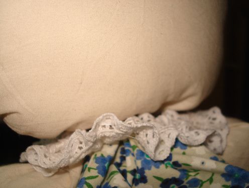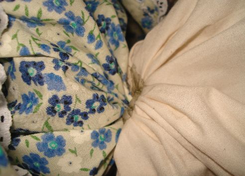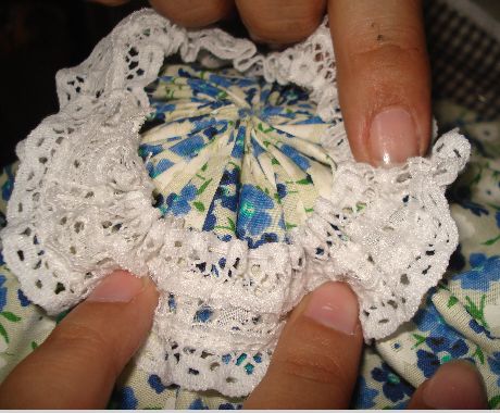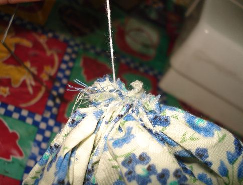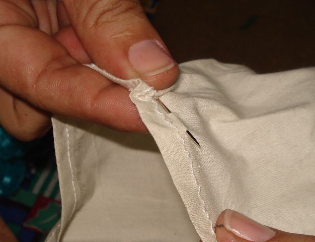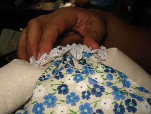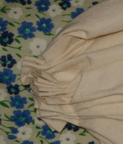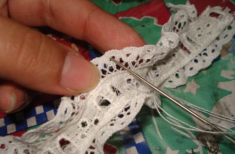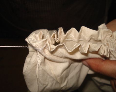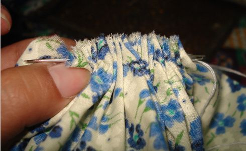 Haremos el mismo procedimiento que realizamos con la Tela de Manta, es decir que haremos unas puntadas con hilo blanco y aguja dejando espacios entre si para luego fruncirlas.