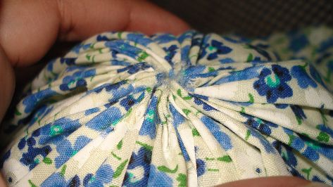 Con una aguja e hilo blanco iremos cosiendo la bolsa del extremo, en el cual no se encuentra el elástico, y dejando espacios entre cada puntada, de tal manera que nos vaya quedando asi: