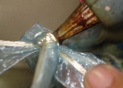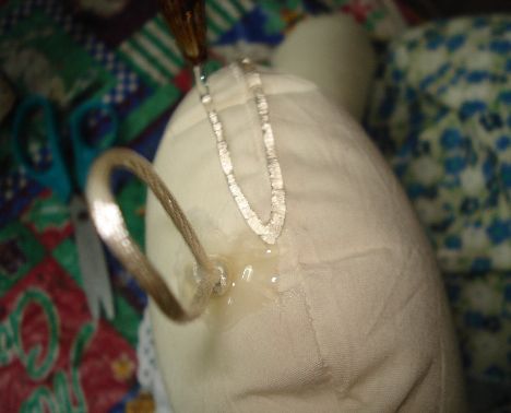 Al tenerlo ya bien pegado, colocaremos silicona en el espacio que nos ha quedado entre el listón para pasar a pegarle la cabecita de la muñeca.