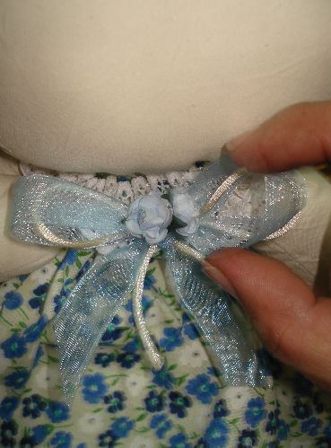 Comenzaremos con el cuello. Pondremos del mismo listón que usamos en la parte de abajo del vestido para que tenga similitud toda la decoración de la muñeca.